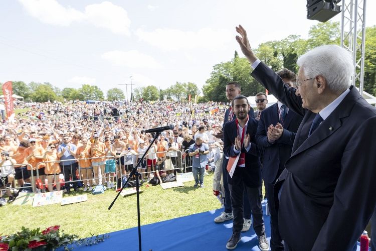 Il capo dello Stato è arrivato in Toscana in elicottero per aprire il YouTopicFest. Oltre 5.000 giovani alla marcia contro la guerra
