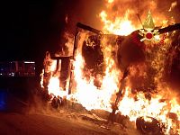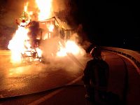 CALENZANO — Il tir carico di carta avvolto dalle fiamme e il conducente, un uomo di 40 anni, che rimane ustionato e intossicato nel tentativo di spegnere il rogo con l'estintore: è successo prima dell'alba a Calenzano, in via di Barberino in località Le Croci.