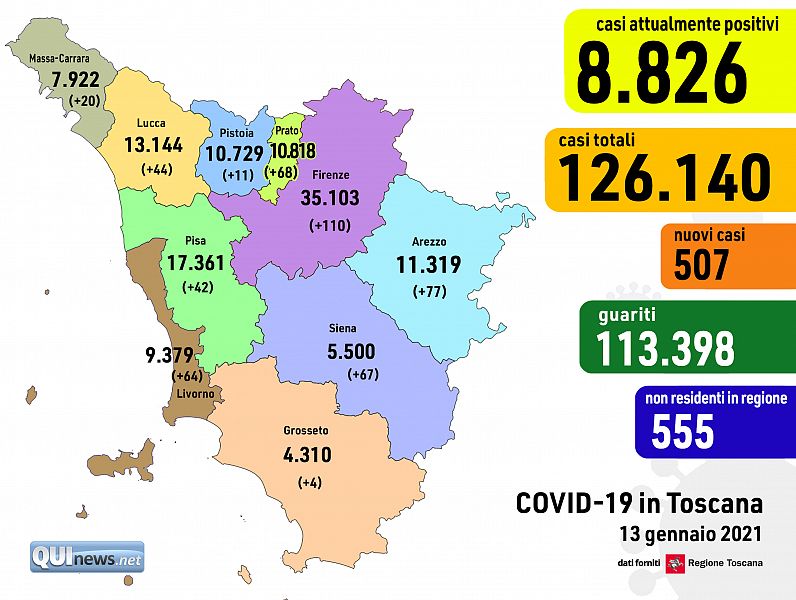 - 35.103 i casi complessivi ad oggi a Firenze (110 in più rispetto a ieri), 10.818 a Prato (68 in più), 10.729 a Pistoia (11 in più),