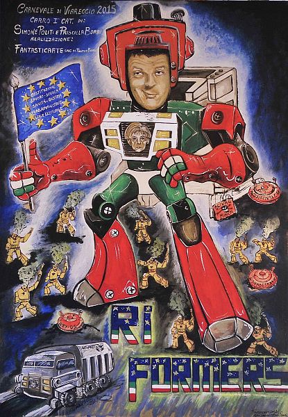 VIAREGGIO — Il premier Matteo Renzi in una quadrupla versione: nei panni di Pinocchio, di un grande robot, come illusionista e a cavalcioni della tartaruga delle riforme. E ancora la Cancelliera tedesca Angela Merkel partoriente, Papa Francesco ai fornelli e in braccio a Putin, l'immancabile Berlusconi che tenta la scalata al Colle e l'Italia allo sbando.