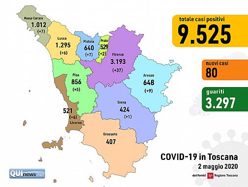In Toscana oggi arrivano a 9.525 i casi di positività al Coronavirus, 80 in più rispetto a ieri (+0,8%rispetto al totale).