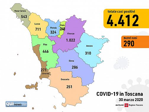Con 290 nuovi casi positivi invece il totale dei contagiati diventa 4.412, fra cui una neonata residente nel grossetano.
