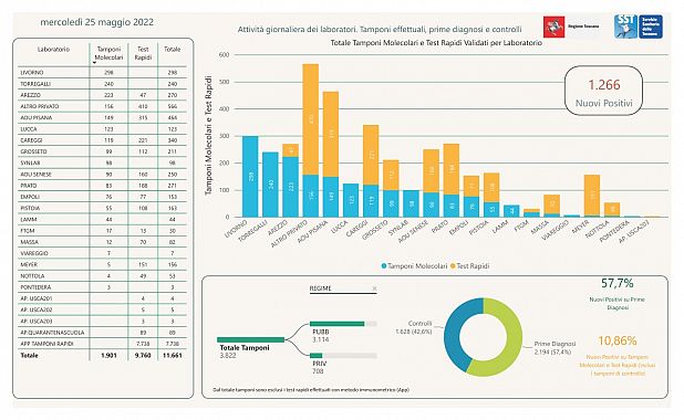Sono stati eseguiti 11.661 test di cui 1.901 tamponi molecolari e 9.760 test rapidi.