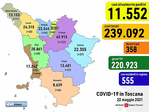 - 65.915 i casi complessivi ad oggi a Firenze (127 in più rispetto a ieri), 22.037 a Prato (43 in più), 22.544 a Pistoia (26 in più),