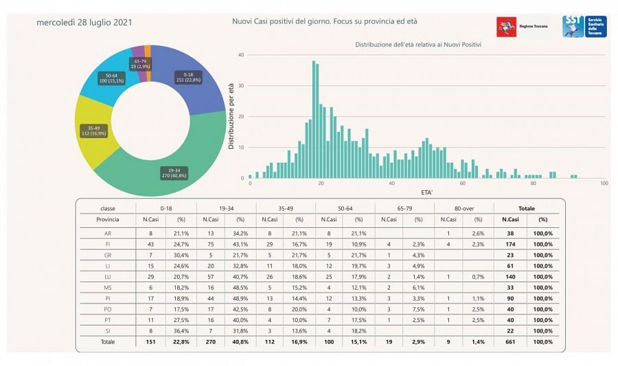 Le località non citate non hanno registrato nuovi positivi, per quanto riguarda l'età dei nuovi positivi solo 28 casi su 661 riguardano persone con più di 65 anni.