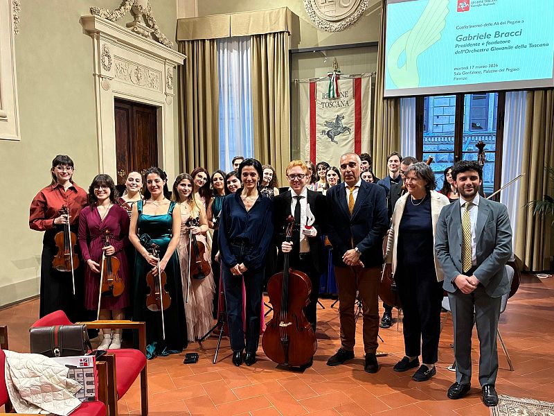 La consegna è avvenuta questa mattina, durante una cerimonia nella sala Gonfalone. A consegnare il premio la presidente del Consiglio regionale Stefania Saccardi e il vicepresidente Diego Petrucci che ha proposto l’onorificenza all’Ufficio di presidenza. Presenti anche l'assessore alla Cultura della Giunta toscana Cristina Manetti, il consigliere Enrico Tucci e, in collegamento, Diego Fiorini, presidente della Fondazione del teatro Verdi di Pisa che ospita l’Orchestra, fondata nel 2020 dallo stesso Bracci e Matteo Chimenti.