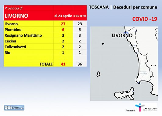 Totale deceduti in provincia di Livorno 41 (+5) - Maggior incremento Livorno da 23 a 27 (+4) - Nessun nuovo Comune con decessi