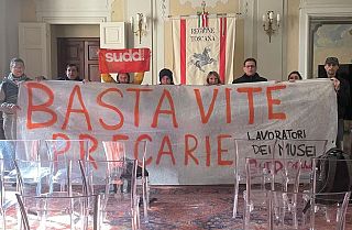 FIRENZE — Blitz nel palazzo della presidenza della Giunta toscana, in piazza Duomo a Firenze, da parte dei precari storici dei musei fiorentini, che con il sindacato Sudd Cobas hanno occupato una delle sale dell'edificio.
