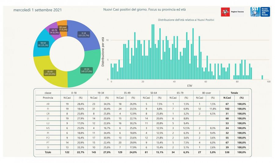 Per quanto riguarda i casi registrati nelle ultime 24 ore, le zone più colpite sono la provincia di Firenze, quella di Livorno, l'Aretino e il Pistoiese. La fascia d'età dove si sono riscontrati più casi è quella tra i 19 e i 34 anni, e rappresenta il 27% dei nuovi casi.