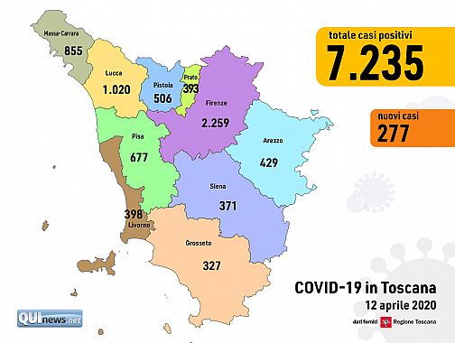 Sono purtroppo 28 i deceduti registrati oggi: si tratta di 18 uomini e 9 donne residenti in Toscana, 1 fuori regione. Il totale dei decessi in Toscana è salito a 495. I nuovi decessi riguardano 9 persone della provincia di Firenze, 2 di Prato, 3 di Pistoia, 3 di Massa, 3 di Lucca, 4 di Pisa, 2 di Livorno 1 di Grosseto.