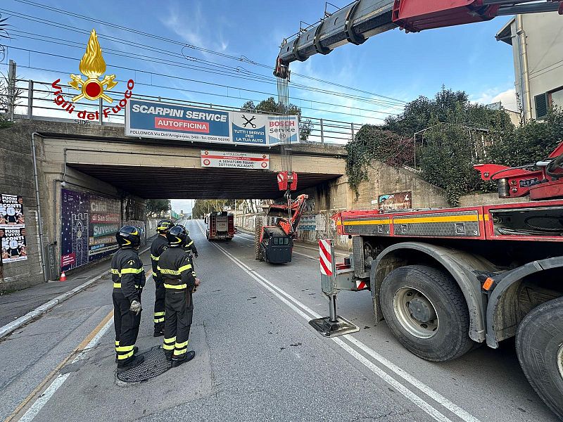 FOLLONICA — Intervento dei vigili del fuoco a Follonica, all’altezza del ponte ferroviario in via Leopardi, per un incidente stradale che ha coinvolto un furgone adibito al trasporto di un escavatore.