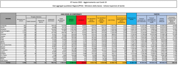 Qui sotto la tabella del Ministero della salute con i dati di tutte le regioni.