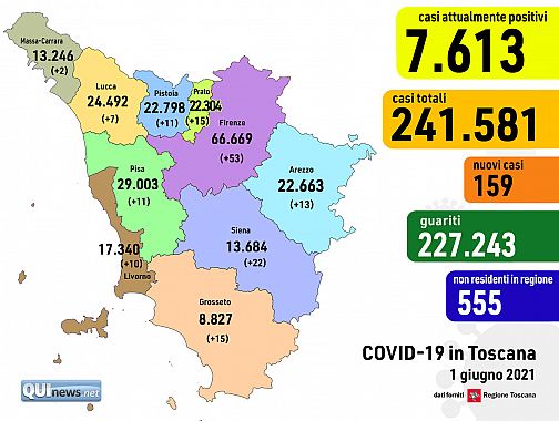 - Sono 66.669 i casi complessivi ad oggi a Firenze (53 in più rispetto a ieri), 22.304 a Prato (15 in più), 22.798 a Pistoia (11 in più),