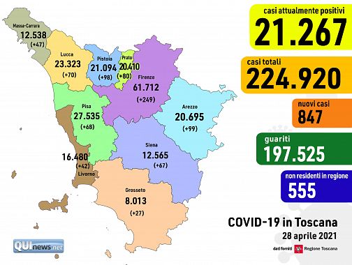 - 61.712 i casi complessivi ad oggi a Firenze (249 in più rispetto a ieri), 20.410 a Prato (80 in più), 21.094 a Pistoia (98 in più),