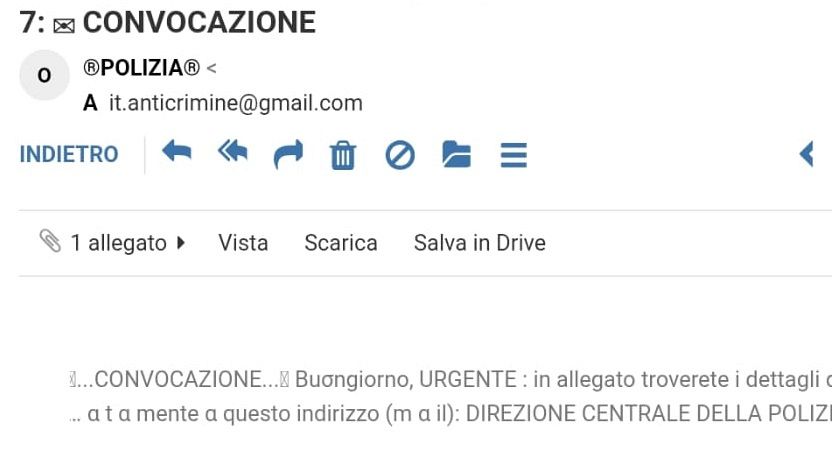 L'intestazione dell'email può già trarre in inganno, perché attiva l'utente nel mirino con le parole "urgente", "anticrimine", "polizia": ecco qui di seguito, grazie allo screenshot che ne ha fatto e che ci ha fornito una delle persone finite nel mirino, come appare confezionata.