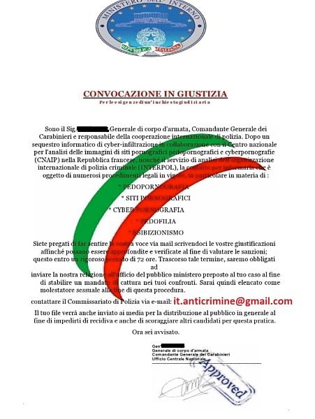 Il raggiro punta sullo spavento e sul senso di urgenza e sgomento impresso a chi riceve la comunicazione che reca tanto di filigrana tricolore e di logo con la scritta "Ministero dell'interno". Una contraffazione.