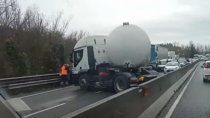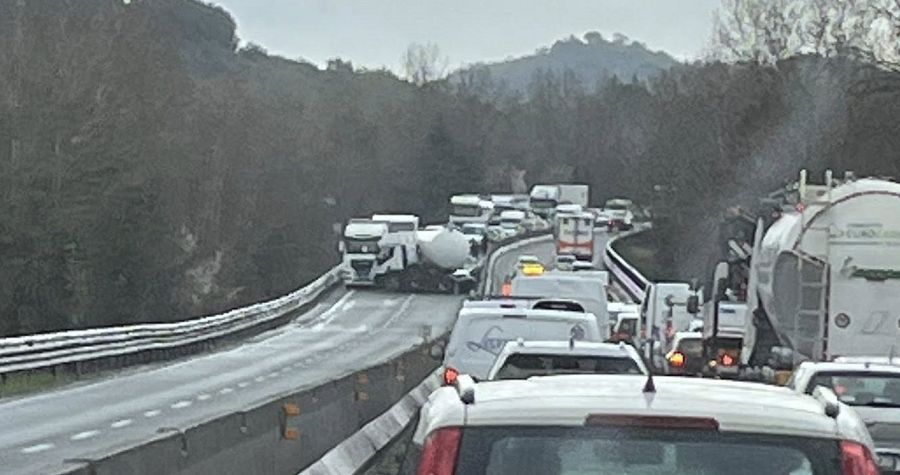 Il camion cisterna, coinvolto nello scontro con un altro mezzo pesante, ha ostruito l'intera carreggiata. Incolonnamenti di chilometri