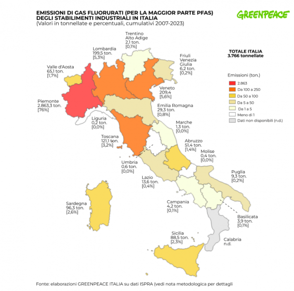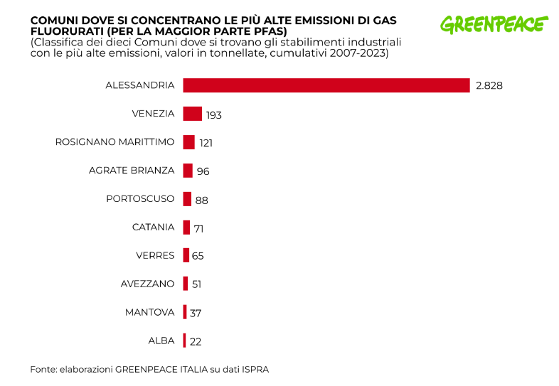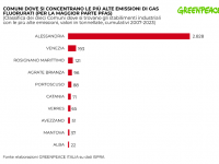 Come si vede nella mappa elaborata da Greenpeace, le emissioni di gas fluorurati contabilizzate in Toscana costituiscono il 3,2% del totale italiano coperto in misura imponente, come detto, dal Piemonte con traino nel comune di Alessandria. "Il restante 24% delle emissioni è in larga parte attribuibile alle industrie localizzate in Veneto (in particolare nella zona di Venezia), Lombardia e Toscana", affermano gli autori dell'inchiesta.
