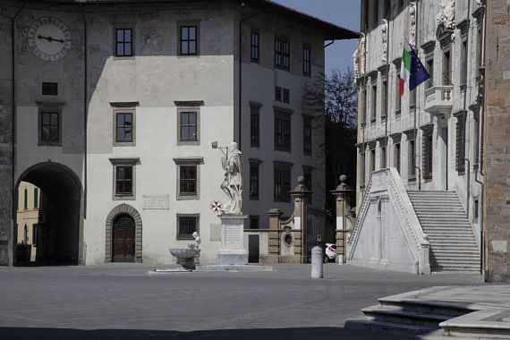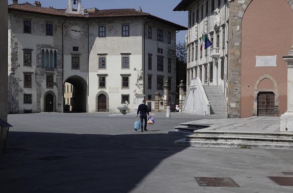 In Piazza dei Cavalieri in pochi si concedono una passeggiata e un po' di sole. Per poco tempo a due bambini è permesso giocare a palla sul sagrato della Chiesa di Santo Stefano. E alla statua di Ulisse Dini qualcuno ha messo la mascherina...