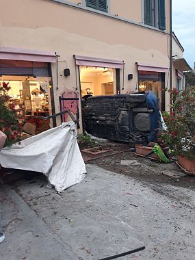 L’incidente è avvenuto questa mattina, l'auto condotta da un giovane si è ribaltata e poi è finita contro la vetrata del locale