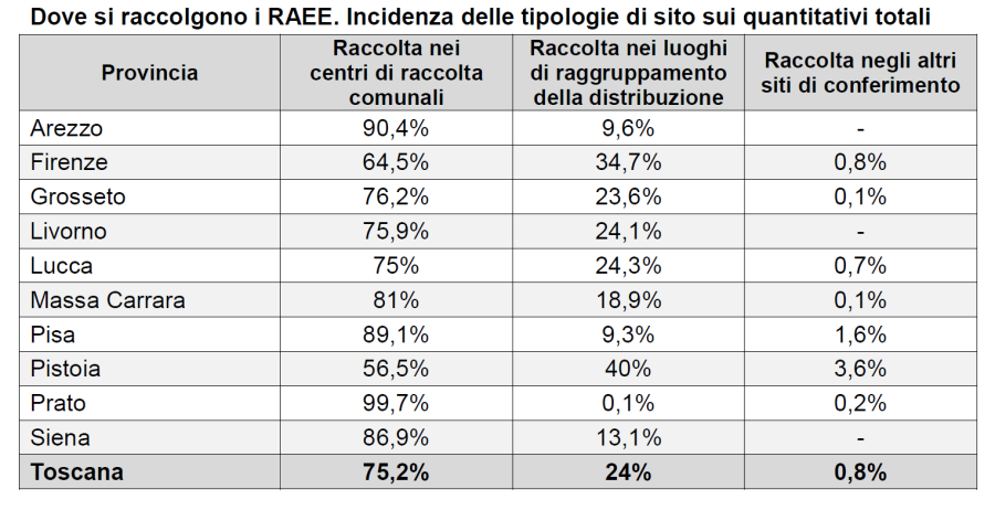 Risultati molto positivi anche per Grosseto (9,93 kg/ab), Firenze (9,54 kg/ab), Siena (8,46 kg/ab), Pistoia (8,15 kg/ab), Pisa (8,03 kg/ab), Arezzo (8 kg/ab) e Massa Carrara (7,73 kg/ab), tutte con valori pro capite superiori alle rispettive medie nazionali nella raccolta di freddo e clima, grandi bianchi e piccoli elettrodomestici ed elettronica di consumo. Unica provincia della regione sotto la media italiana è Prato, che si attesta a 3,16 kg/ab.
