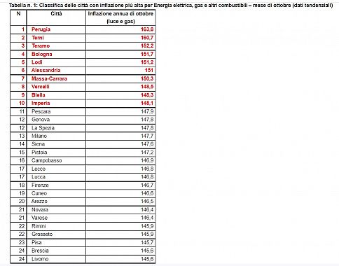 In vetta alla classifica delle città più care c'è Perugia, dove le spese per luce e gas volano del 163,8% su Ottobre 2021, al secondo posto Terni, +160,7% ed a seguire Teramo (+152,2%).
