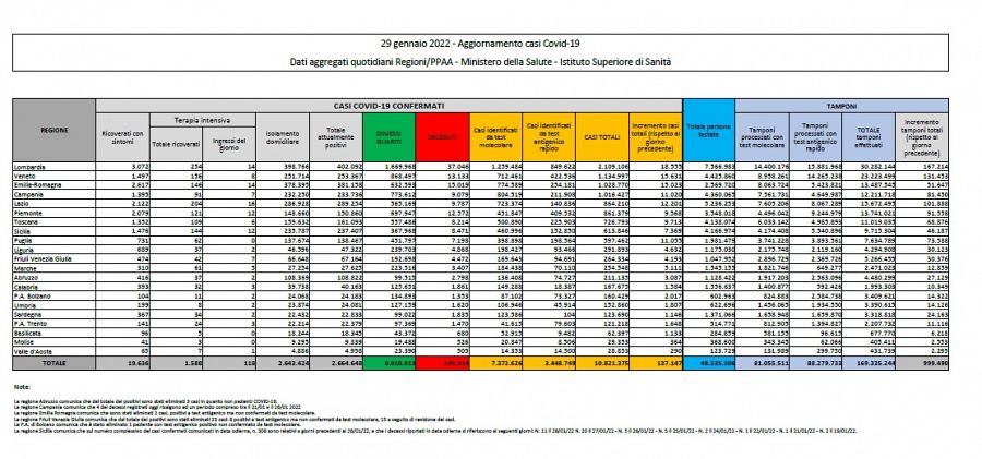 Nei reparti Covid ordinari i ricoverati sono 19.636, ovvero 160 in meno rispetto a ieri. Nelle terapie intensive i pazienti sono 1.588, 42 in meno nel saldo tra ingressi e uscite.