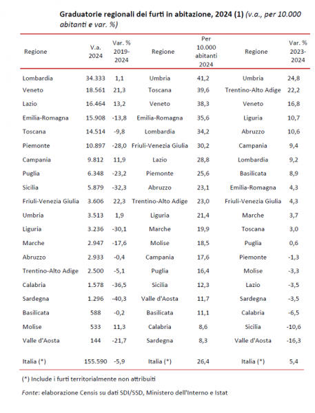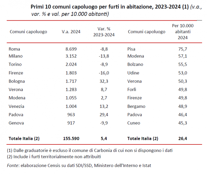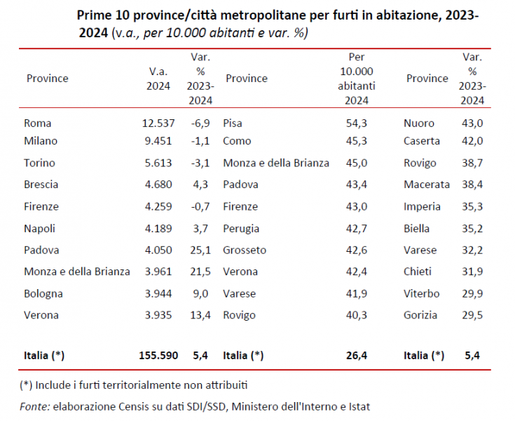 In totale in Italia nel 2024 sono stati denunciati 155.590 furti in casa (+5,4% rispetto al 2023) e 1.891 rapine (+1,8% rispetto al 2023).