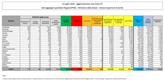 Le regioni con più contagi registrati tra ieri e oggi sono la Lombardia con 77 positivi (32,9%) e l'Emilia Romagna con 70 (30,3%). Anche la Calabria registra 28 nuovi casi che sarebbero tutti riconducibili ai migranti sbarcati negli ultimi giorni.