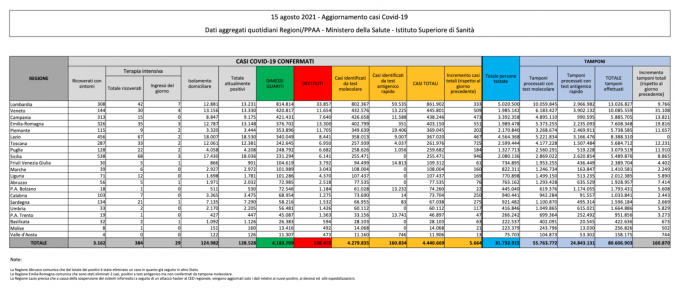 I ricoverati con sintomatologia da Covid-19 nei reparti ordinari sono oggi 3.162, 61 in più rispetto a sabato 14 Agosto.