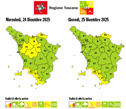 TOSCANA — Pioggia e neve fanno scattate l'allerta meteo anche nel giorno di Natale.