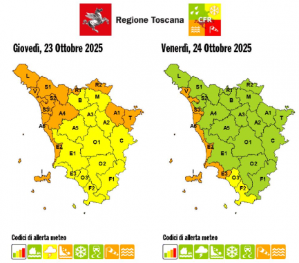 TOSCANA — Prosegue su parte della Toscana l'allerta meteo per vento e mareggiate, estesa fino a domani, venerdì 24 Ottobre, su costa centrale e arcipelago.