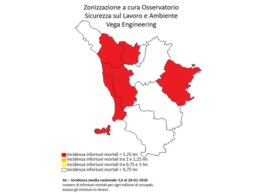 TOSCANA — Con 10 vittime (9 sul lavoro e una in itinere) nei primi due mesi del 2026, la Toscana finisce in zona rossa, quella che nel report dell'Osservatorio Vega raggruppa le regioni con l’incidenza di mortalità sul lavoro più alta rispetto alla media nazionale.