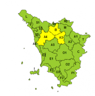 Il codice giallo interesserà domani il Valdarno fiorentino e inferiore e le aree del Bisenzio e dell’Ombrone pistoiese