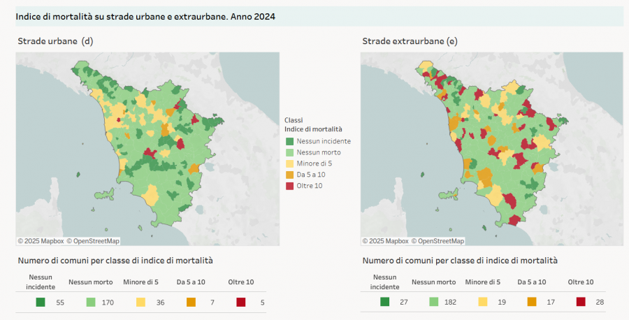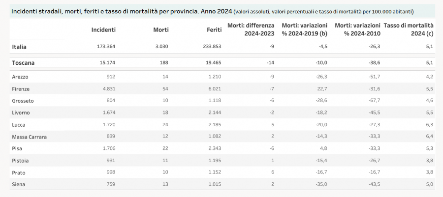 Il numero più basso di incidenti si è verificato invece nel Senese, dove tuttavia rispetto al 2023 hanno perso la vita 2 persone in più per un totale di 13 vittime della strada.