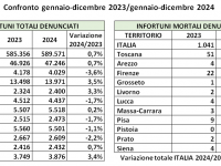 Per quanto riguarda gli infortuni, il trend di diminuzione accomuna tutte le province tranne Lucca (+1,6%). Prato (-17,4%), Grosseto (-17,2%) e Massa Carrara (-16,3%) vedono percentuali negative a doppia cifra. Il maggior numero di infortuni si è verificato nell'area metropolitana di Firenze (2.062, -7,9%).