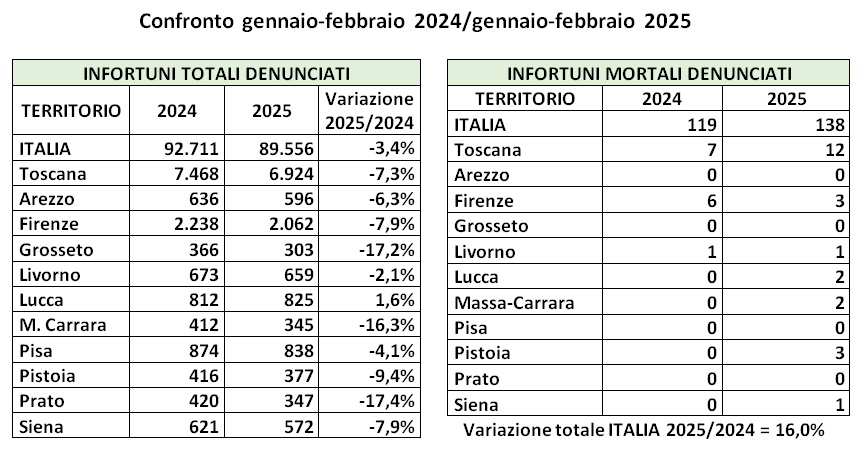 Se fra Gennaio e Febbraio il numero assoluto degli infortuni sul lavoro è sceso rispetto allo stesso periodo del 2024, i decessi sono però passati da 7 a 12. In aumento anche le malattie professionali denunciate.