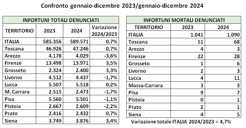 Le malattie professionali hanno registrato un'impennata ad Arezzo (+45,8%), Pistoia (+39,6%), Grosseto (+26,7%) e Prato (+25,6%), mentre sono state in diminuzione a Massa Carrara (-14,2%), Lucca (-9,3%) e Livorno (-8,4%).