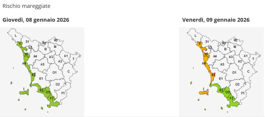 Per il rischio mareggiate, il codice di allerta è arancione e riguarda la costa centro-settentrionale e l'Arcipelago dalle 12 di domani fino al resto della giornata. Già dalla mezzanotte di oggi, comunque, è in vigore l'allerta di codice giallo.