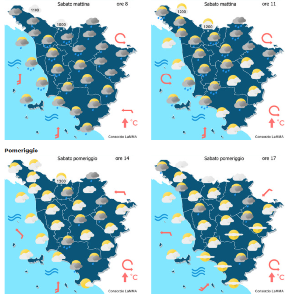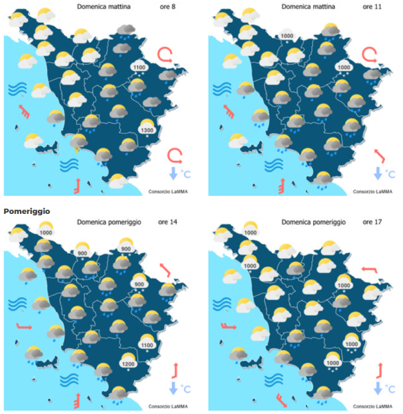 Se oggi le temperature tutto sommato tengono, domani arriva un calo che riporterà le massime ovunque fra 8 e 11 gradi e le minime diffusamente a 5 gradi, sporadicamente qualcosa di più con punta di 8 gradi a Livorno.