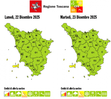 Il bollettino di criticità, con codice giallo, sarà valido dalle 18 di oggi e per tutta la giornata di domani, martedì 23 dicembre.