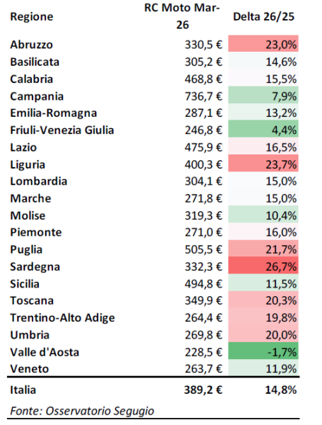 Consolazione: non si tratta del prezzo più alto, visto che la palma va alla Campania dove in media la Rc Moto costa 736,7 euro ma con un aumento rispetto al 2025 contenuto al +7,9%.
