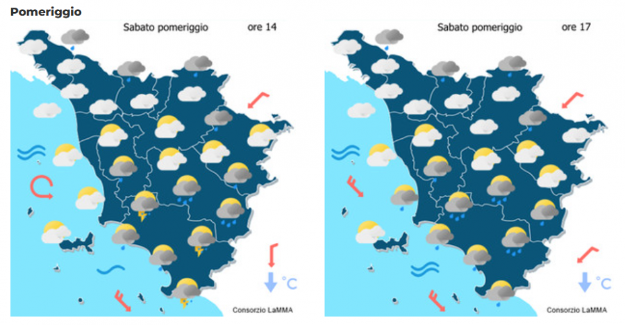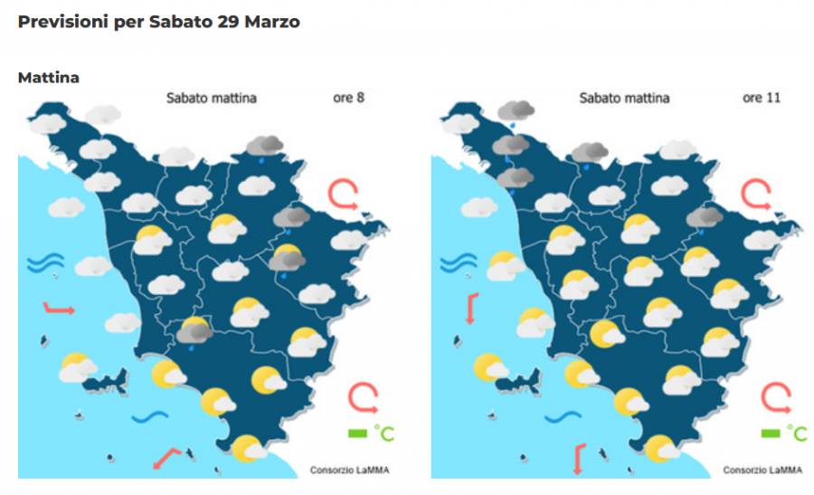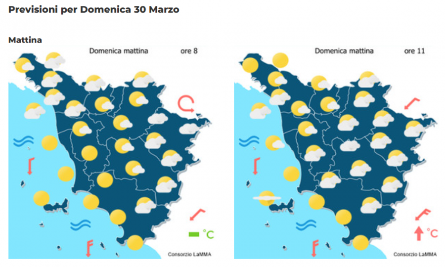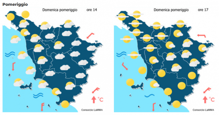 Domani le massime in realtà caleranno di qualche grado, ma comunque in generale si manterranno fra i 15 e i 17 gradi. Solo a Siena se ne registreranno 14. Poi domenica ecco un rialzo fino a 19 e 20 gradi.